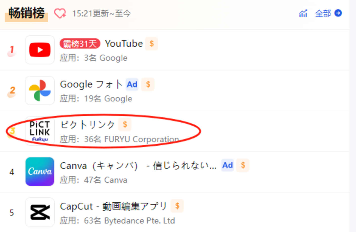 PicTLink 在日本 iOS 摄影与录像畅销榜排名第 3|图片来源:点点数据