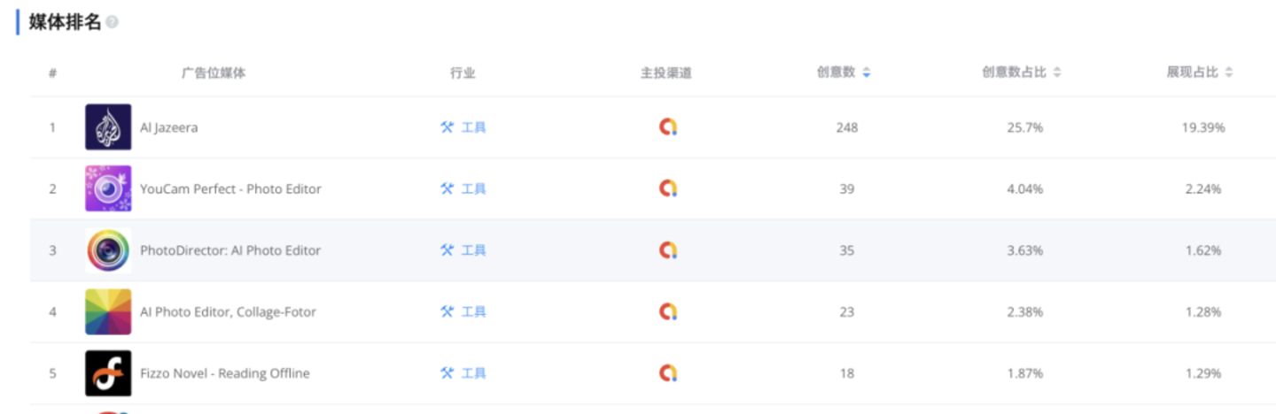 而在投放渠道方面,Google Ads 的投放占比更大,但是从主投媒体看,感觉不是那么精准。在 Google Ads 渠道上投放量最大的“AI Jazzera”是卡塔尔半岛电视台的英文站,属于新闻类 App,而排名 Top5 的主要是修图 App 以及一个小说 App。