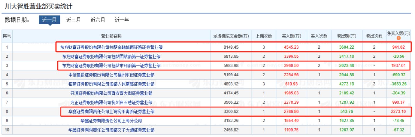 从近一个月内买卖川大智胜的营业部来看,成交额最大的前三家营业部,均来自于有着“散户大本营”之称的东方财富“拉萨天团”。另外值得一提的是,华鑫证券上海宛平南路证券营业部,近一个月净买入川大智胜高达2200余万元,其背后是业内小有名气的游资常用席位之一。