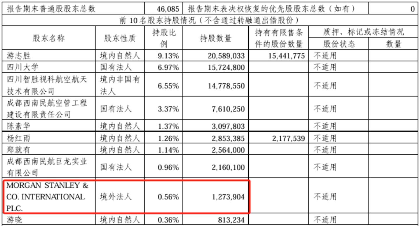 川大智胜最新披露的三季报显示,摩根士丹利首次进入公司的前十大股东,共持有0.56%股份。