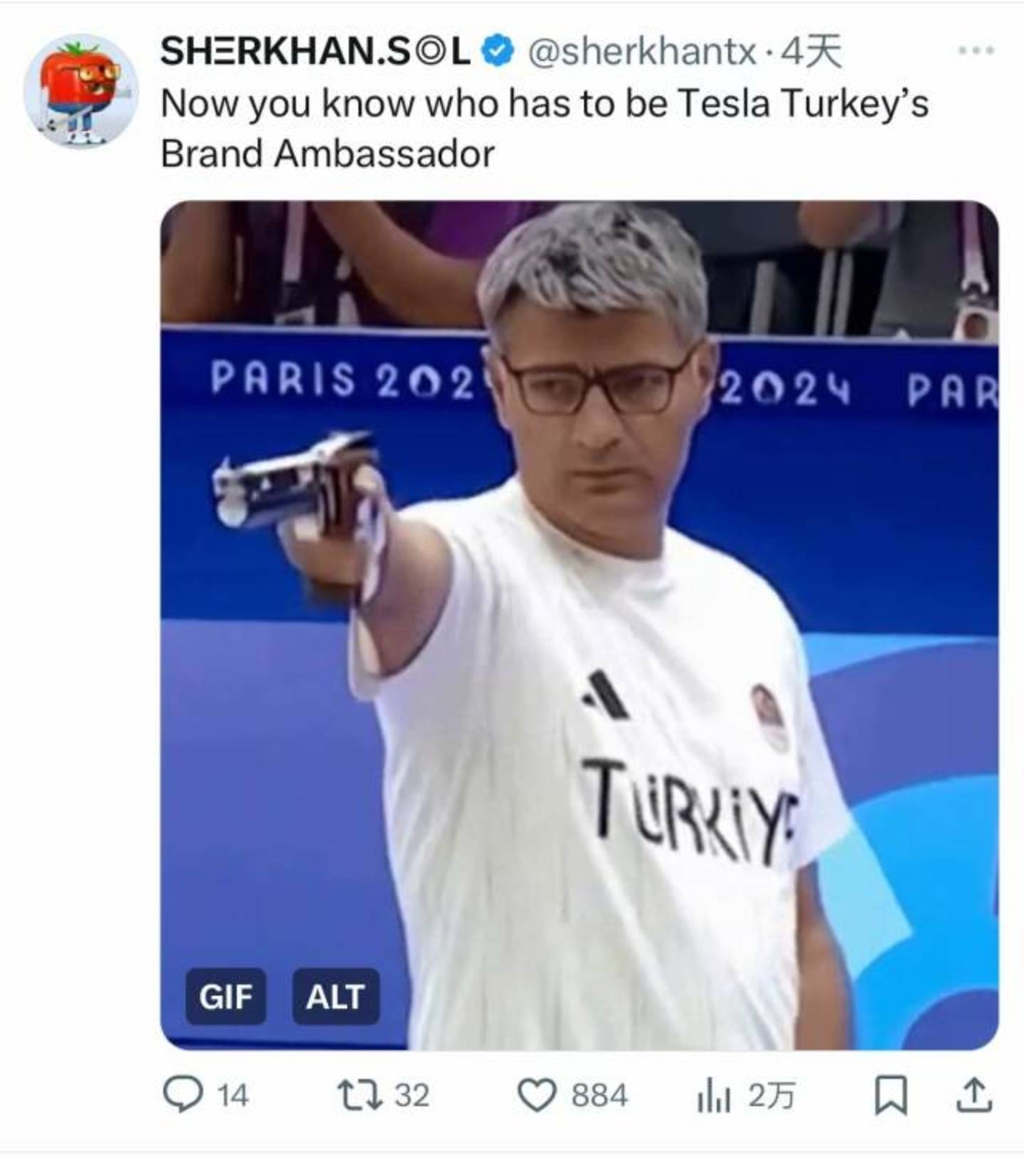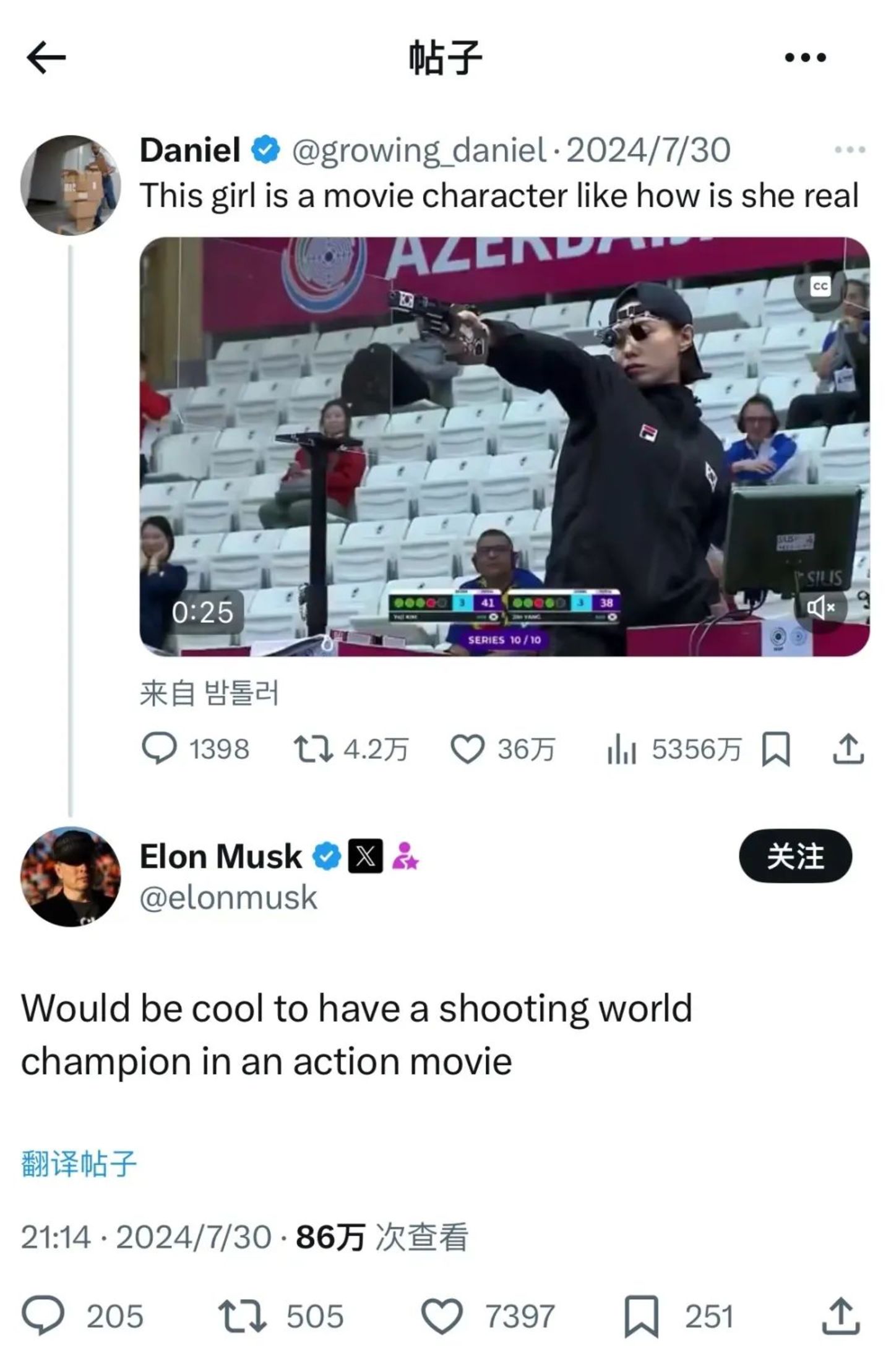 马斯克在推文中评论道:“如果动作片里有射击世界冠军就太酷了。”