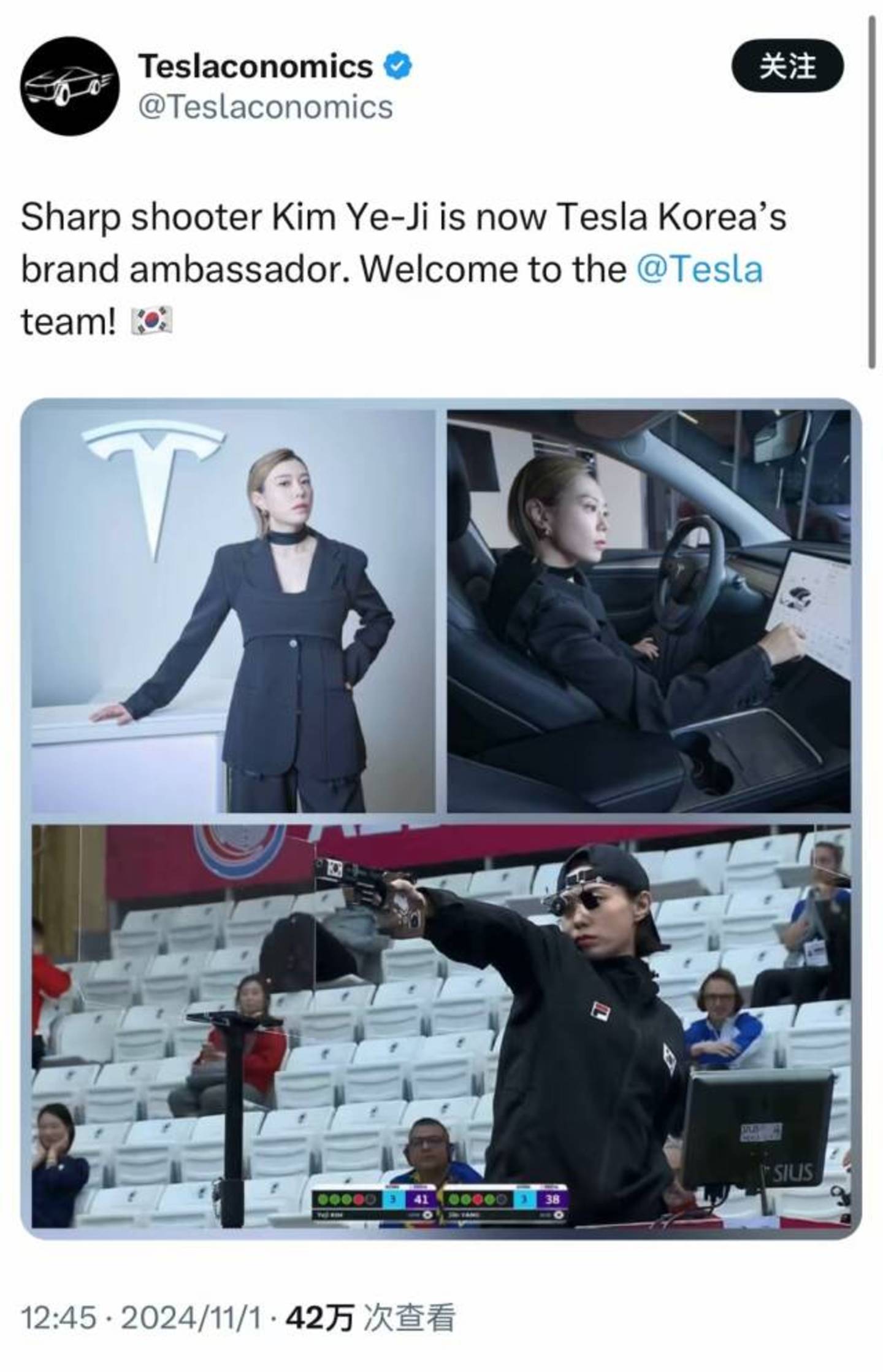 在社交平台“X”上,特斯拉官宣韩国射击运动员金艺智成为“特斯拉韩国”的品牌大使,文案说得很清楚,是韩国限定。而马斯克也在官宣的推文下和网友互动,一定程度上从侧面印证了事情的真实性。
