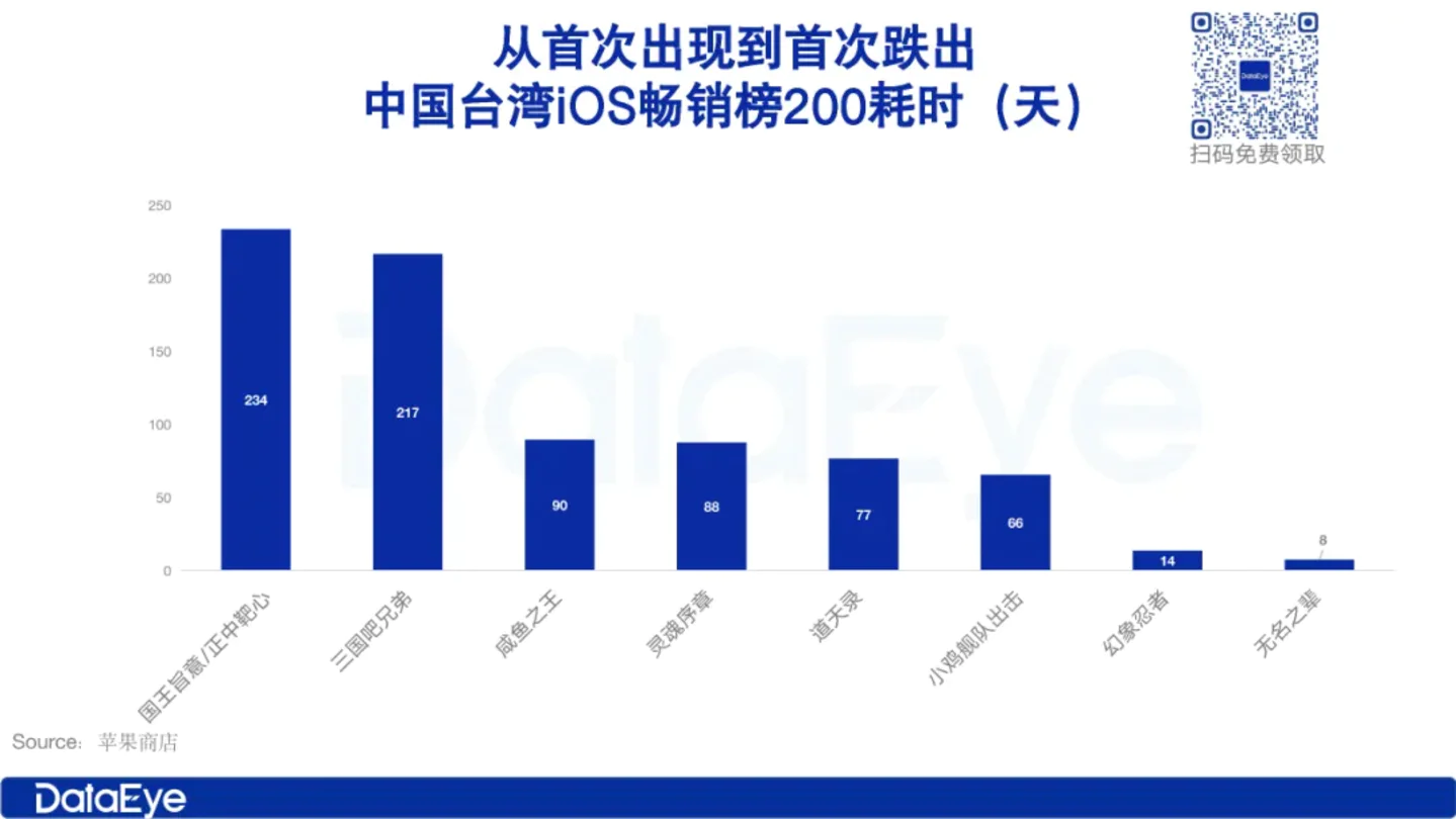 DataEey研究院曾统计过小游戏跌出台湾市场畅销榜TOP200耗时天数,最快的产品仅6天就跌出榜单。