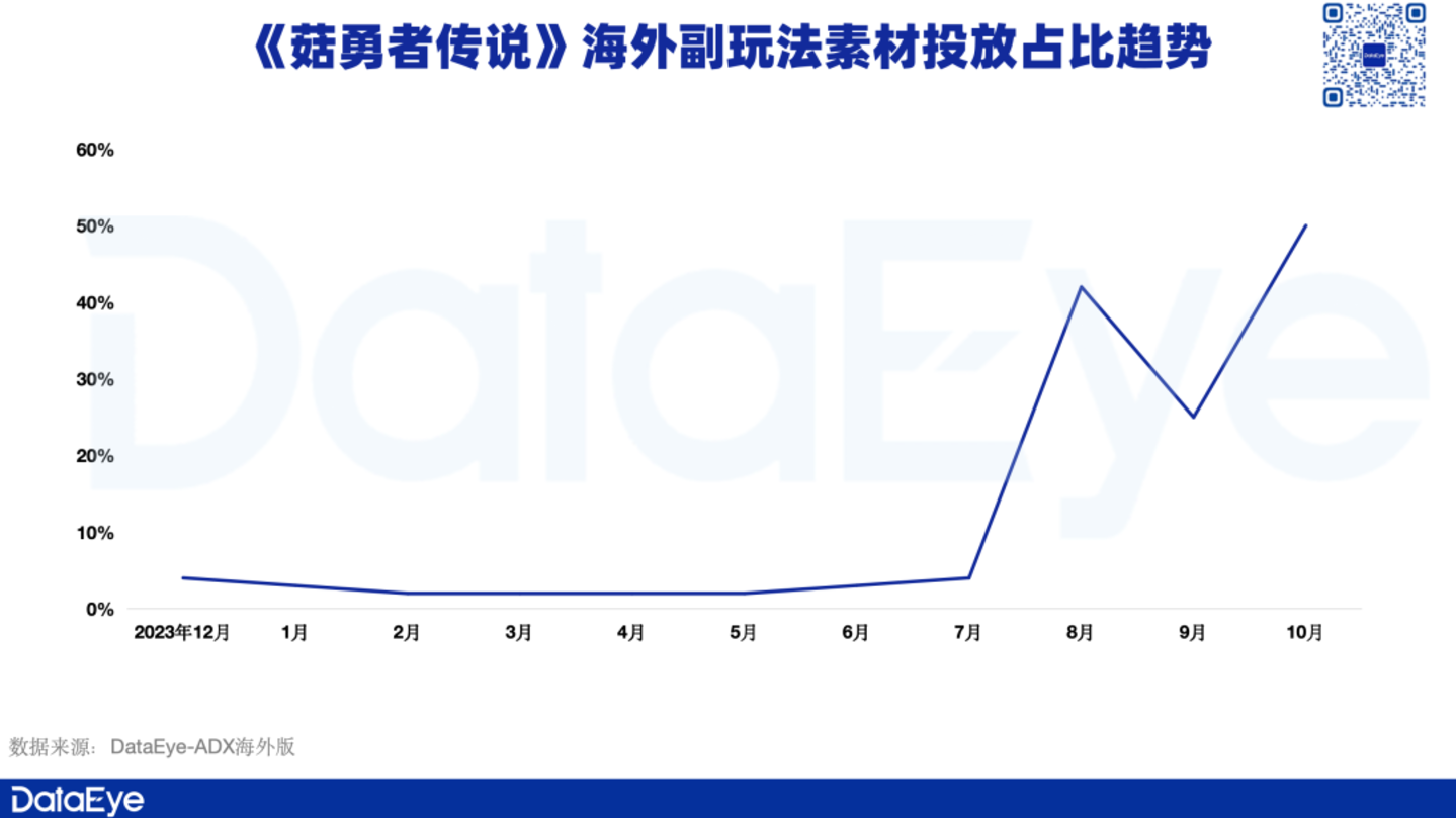 DataEye研究院统计了《菇勇者传说》海外上线至今的副素材投放占比趋势,可以发现《菇勇者传说》从上线之初就开始投放副玩法素材进行吸量,但占比并不高,直到今年8月份,副玩法素材量级才有显著提升,且在10月份时副玩法素材占比环比7月增长近25倍。