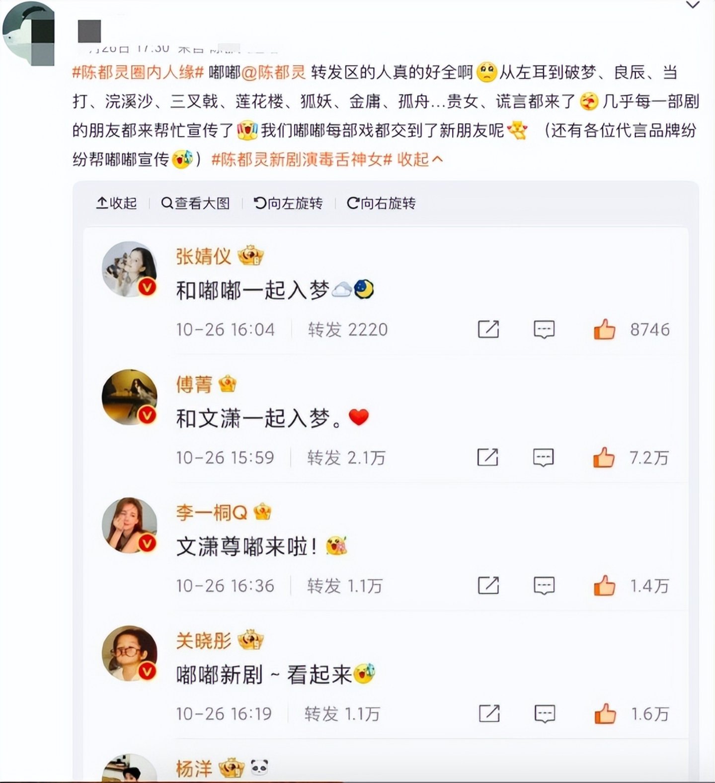 一般来讲,主演摇人的对象主要是昔日合作对象、圈内好友等,在偶像转型加速演员的过程中,团体成员也成为重要组成部分。在“摇人大战”登上微博热搜后,网友发现《大梦归离》女主陈都灵同样一口气拉来了自己参演的《莲花楼》《三叉戟》《孤舟》《左耳》等在内的多部合作剧演员打call。