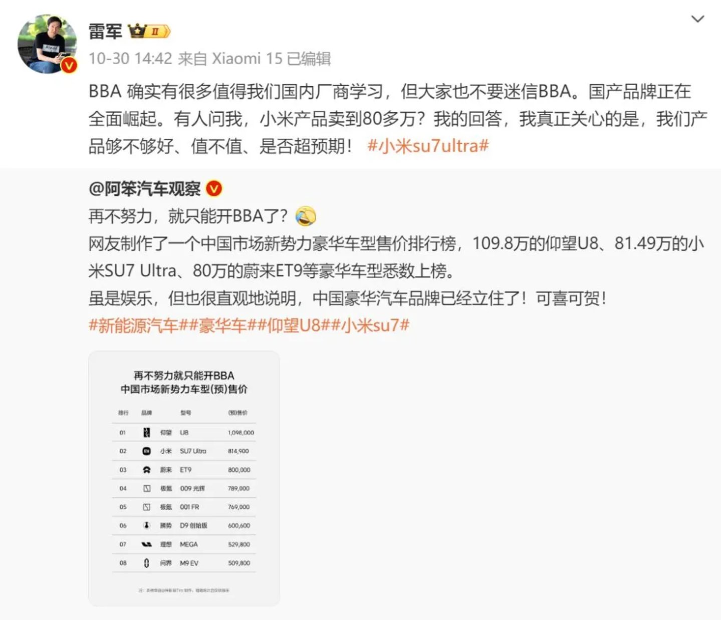 图/雷军认为国产品牌物超所值 来源/微博 新能源观截图