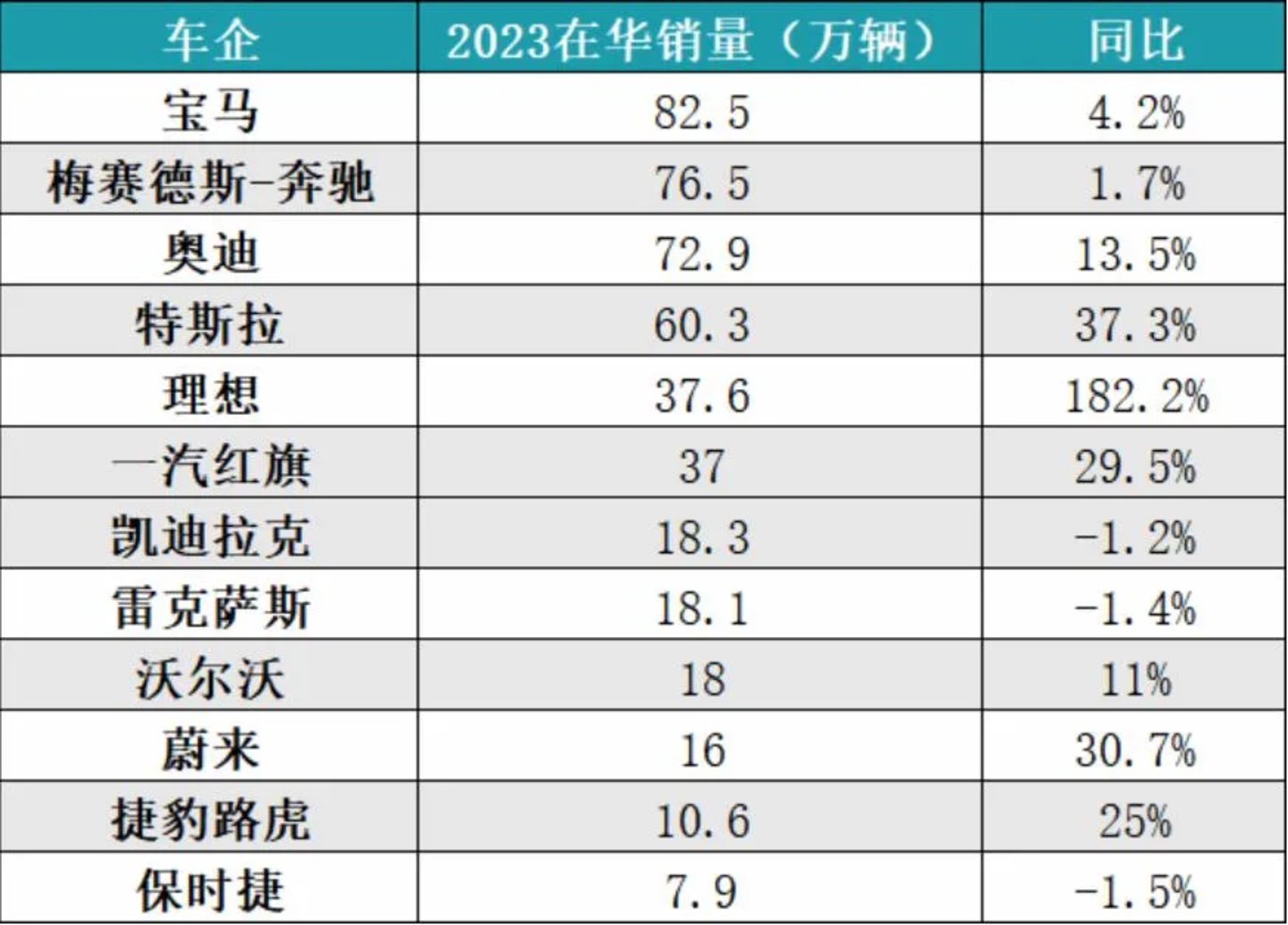 图/各车企2023年在华销量 来源/互联网 新能源观截图