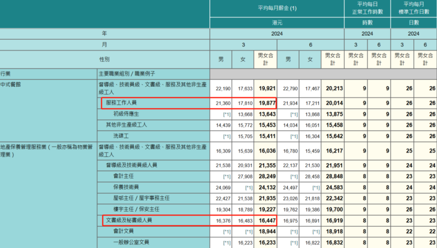 香港餐饮服务员与一般办公室文员薪资对比 图源:香港政府统计处(截至2024年9月26日)