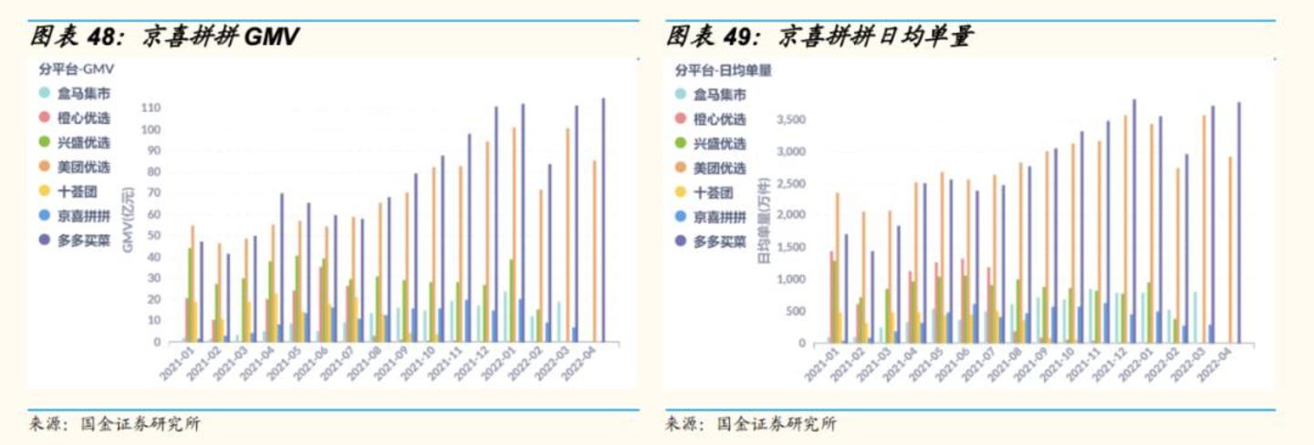 但这换来的是,2021年高峰时期,京喜拼拼的日均单量也没超过700万单。第一梯队的美团优选、多多买菜的日均单量都已经超过了4000万单。