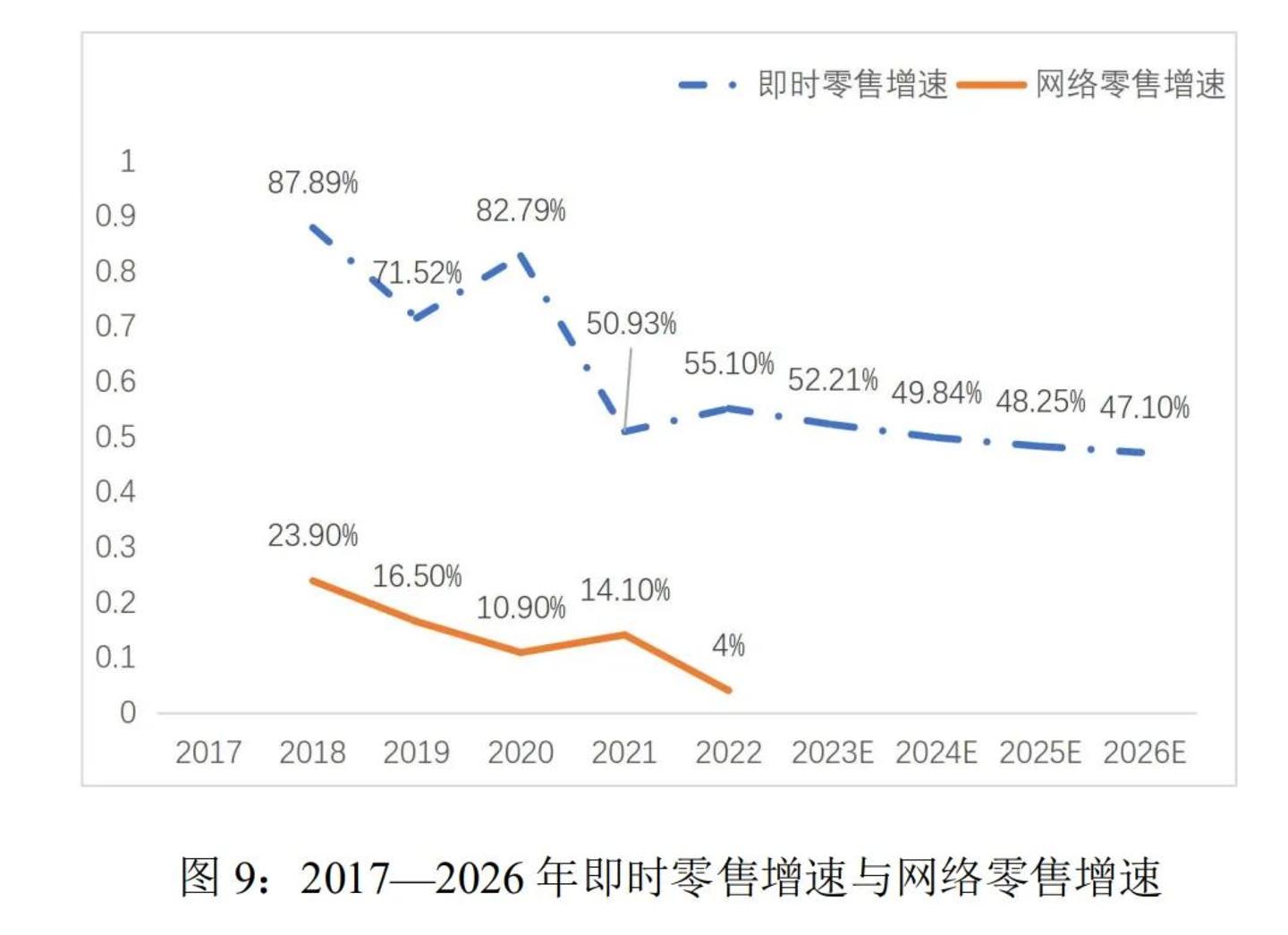 《即时零售行业发展报告(2023)》中指出,2018年以来,即时零售行业的年均增长速度超过了50%,预计到2026年,即时零售的年增长率仍然可能高达47.1%。与同期网络零售总额的增速相比,2020年即时零售增速高出了71.89个百分点,2021年高出了36.83个百分点,2022年高出了51.1个百分点。