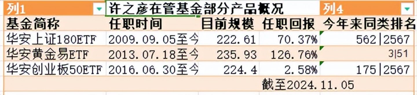 根据今年3季报,自基金合同生效起至2024年9月30日,华安上证180ETF净值增长率339.52%,跑赢业绩基准96.5%;华安创业板50ETF净值增长率-3.68%,跑输业绩基准7.86%;华安黄金易ETF净值增长率116.54%,跑输业绩基准13.11%。