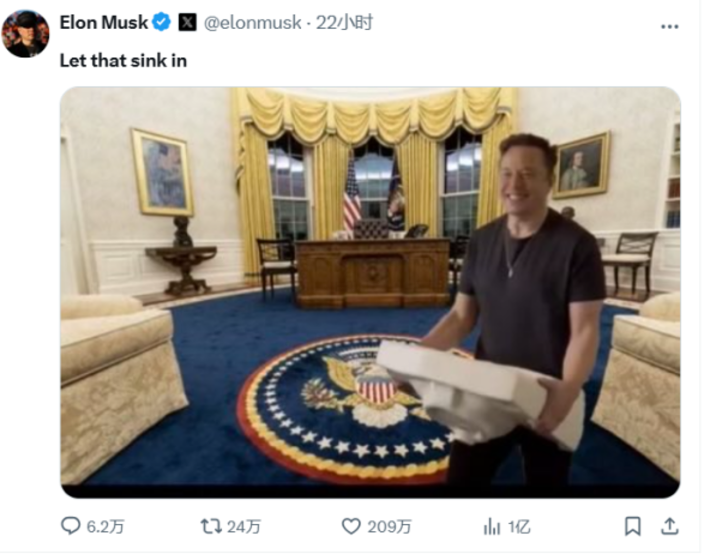 也许用“榜一大哥”形容马斯克在这场竞选中的角色更为贴切,马斯克在特朗普获胜之后也确实在X上“刷火箭”,发布了一张火箭升空的图片庆祝。他也再次拿出了入主推特时候的水槽梗,将自己拿着水槽的形象安在了白宫里。