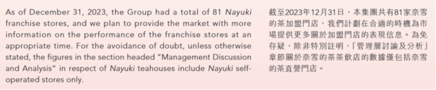 和2023年年报一样,奈雪在三季报中只将直营店绘制成图展现给投资者,而加盟店仅是一笔带过,丝毫没有多说一句的欲望。
