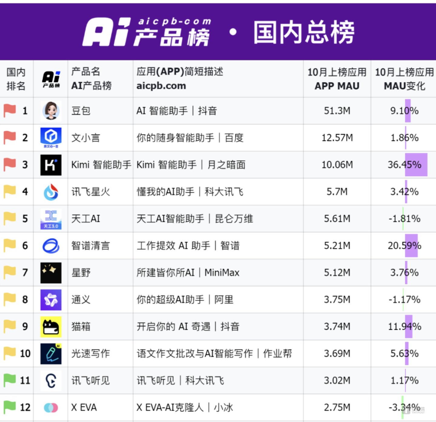 随着ChatGPT引发中国新一轮 AI 热潮,百度先行一步发布文心一言模型,但其仍难以保持领先地位。根据AI产品排行榜等多份公开数据显示,近几个月内,字节跳动旗下的豆包、月之暗面发布的kimi智能助手等产品已成为中国最受欢迎的 AI 聊天机器人,文心一言(文小言)排名第二。