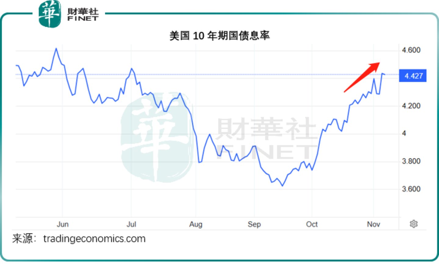国债利率与国债价格走势呈反向,而美国国债市场是全球交易额最大的资产交易市场。资金从债市出逃,国债价格下跌,推高国债市场利率——才能吸引资金进入。由于大选的不明朗性暂时消散,加上特朗普可能推更多刺激经济措施,离开债市的资金追逐高风险资产,这是美股大涨的一个原因。