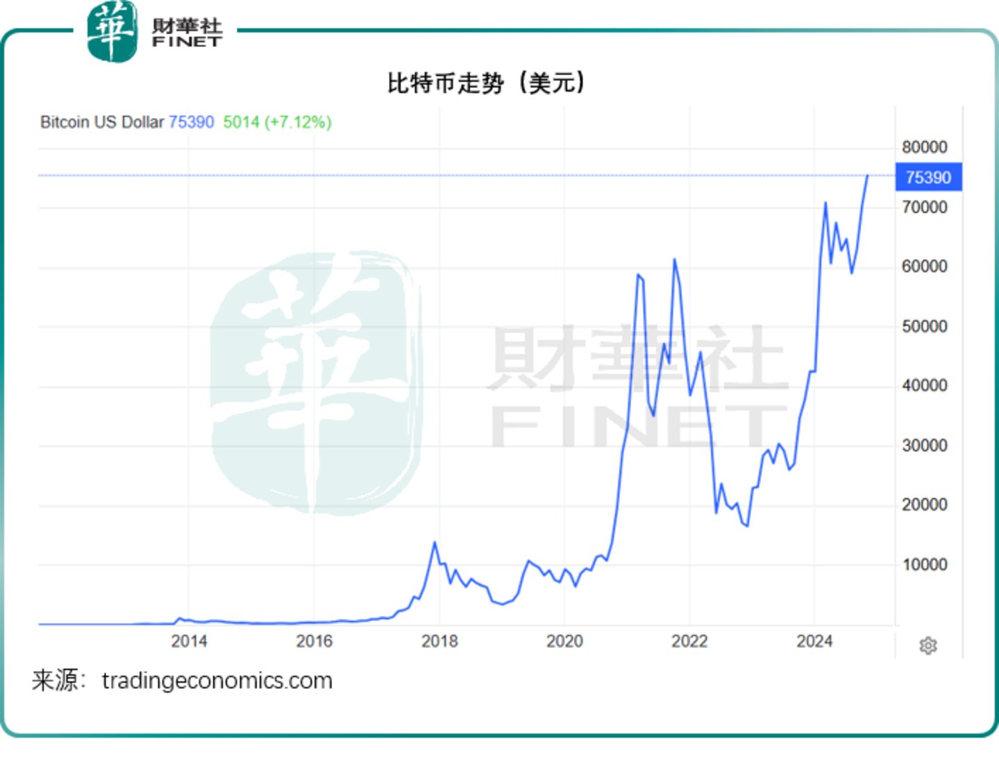 除了追逐股权资产,资金也涌入加密货币,这是因为特朗普曾扬言要放宽对加密货币的监管,这有利于这类资产的走势。骨灰级加密货币比特币再创新高,见下图。