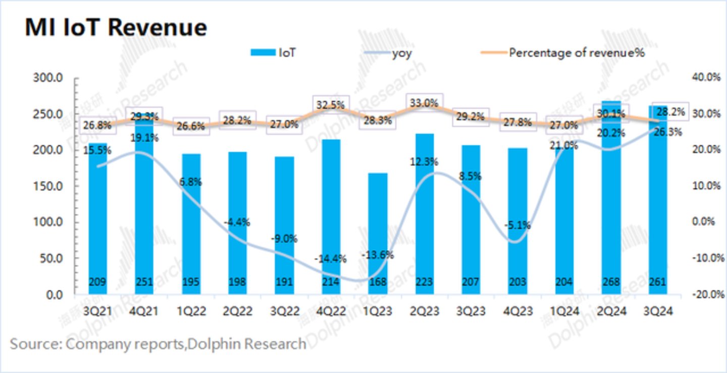 2024年第三季度小米 IoT 业务实现营收261亿元,同比增长26.3%。IoT业务本季度继续高增长,主要得益于中国大陆的大家电业务、境外平板业务和全球可穿戴产品的收入增长。