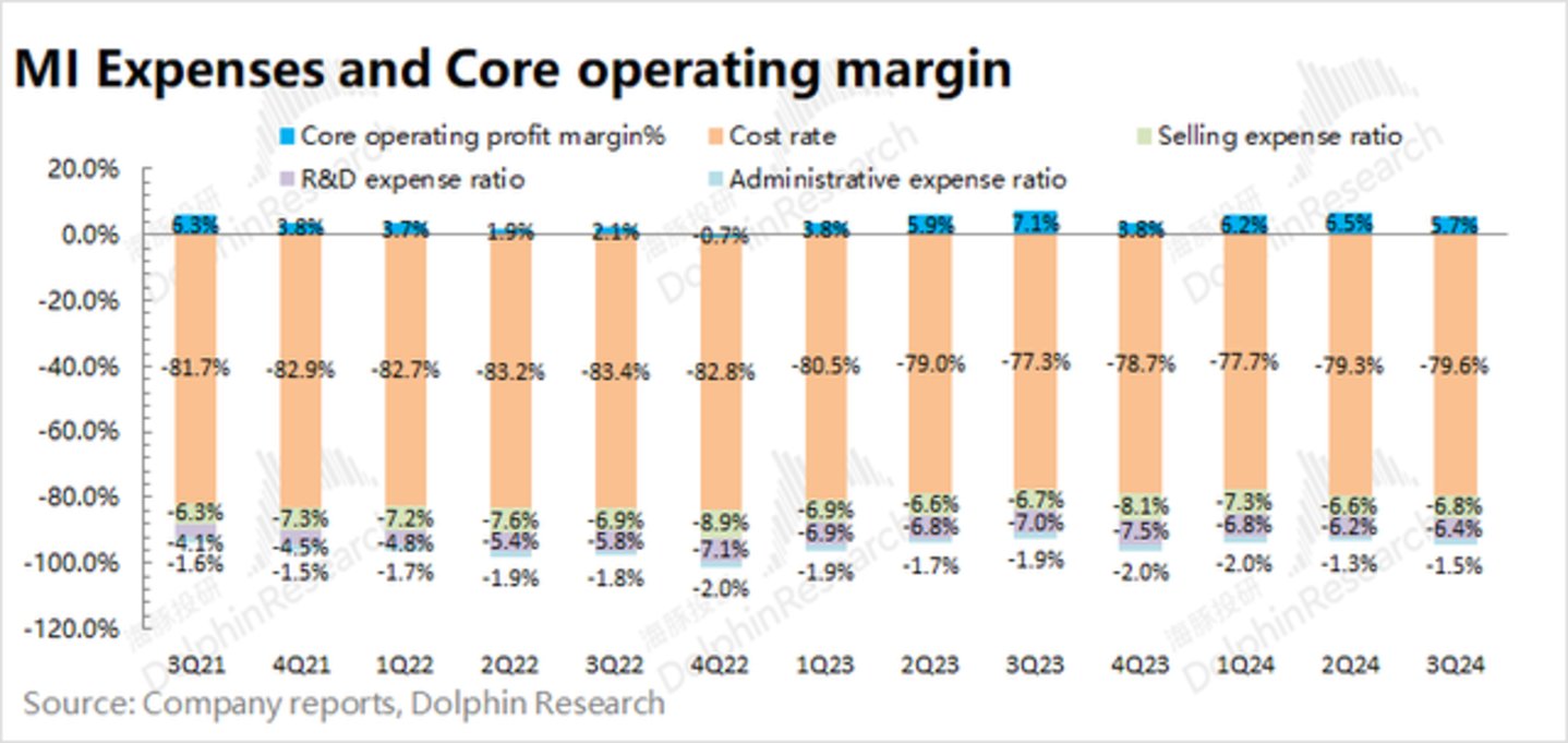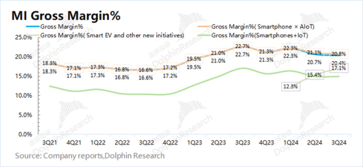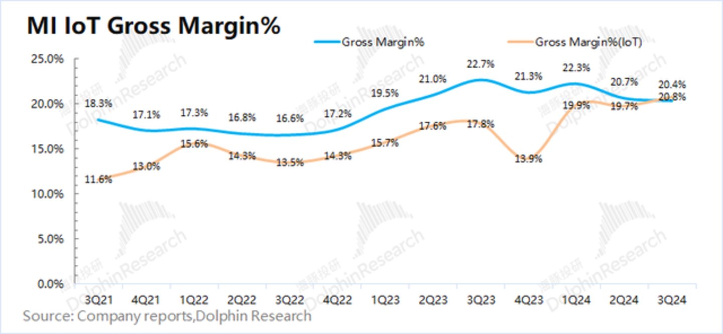 小米集团2024年第三季度毛利率20.4%,同比下滑2.3pct,符合市场预期(20.2%)。