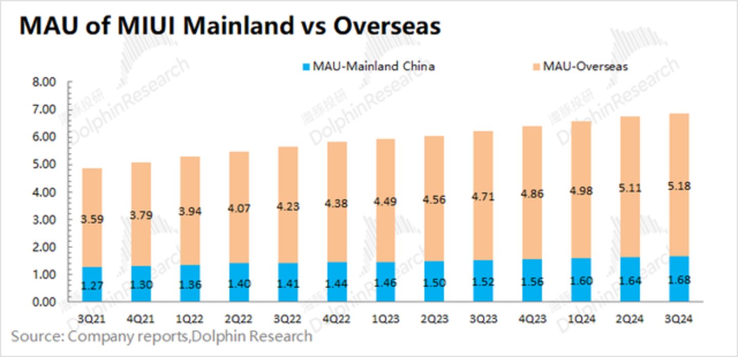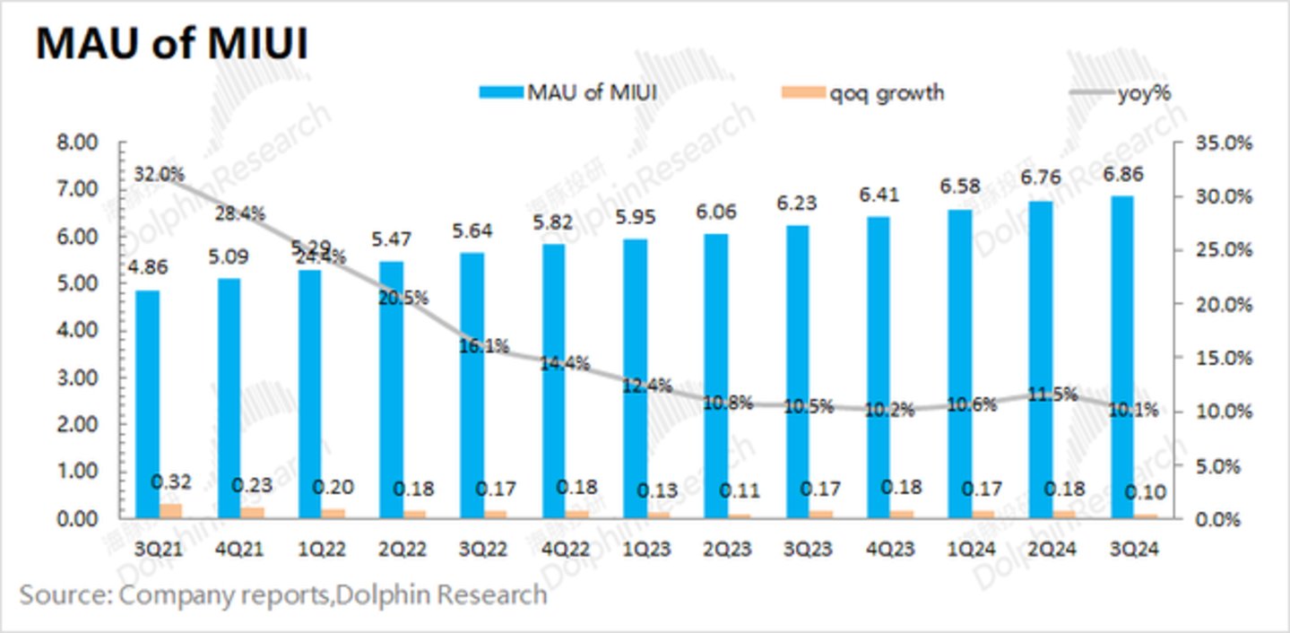 MIUI 用户数:截止到2024年9月,MIUI 月活跃用户数达到6.86亿,同比增长10.1%,本季度MIUI用户增速有所回落,用户数保持着两位数的扩张速度。