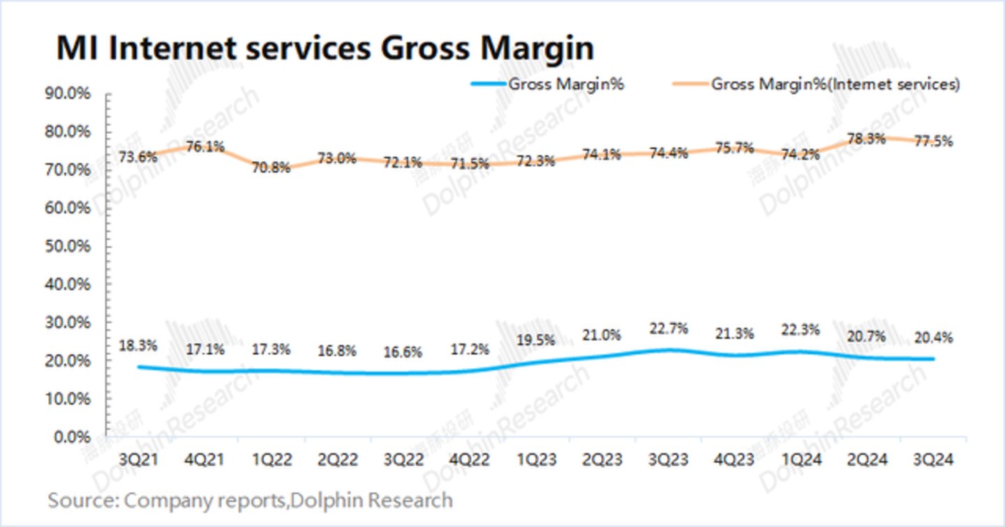 2024年第三季度小米互联网服务业务毛利65.5亿元,同比增长13.6%。本季度互联网毛利率同比上升3.1pct,主要由于本季度公司的广告业务占比继续提升。