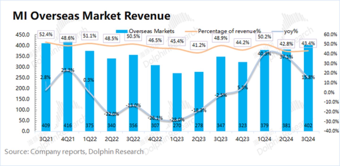 2024年第三季度小米海外收入401.6亿元,同比增长15.8%,收入占比回落至43.4%。本季度海外收入占比下降,主要是财报中汽车业务的新加入。