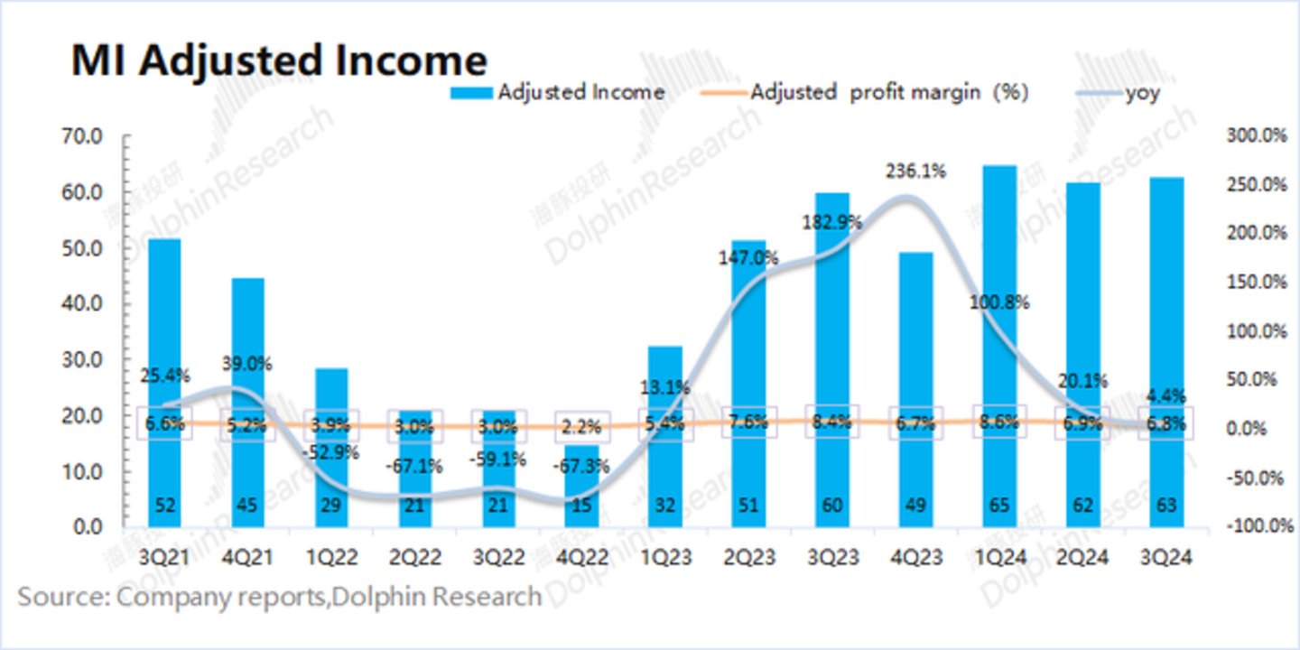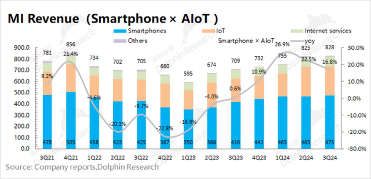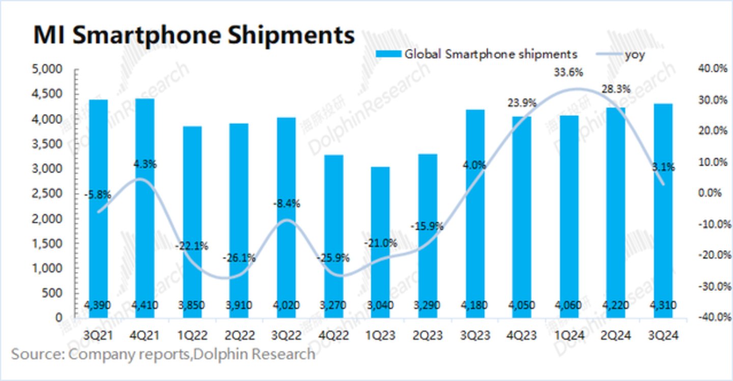 量:2024年第三季度小米智能手机出货量4310万台,同比增长3.1%。