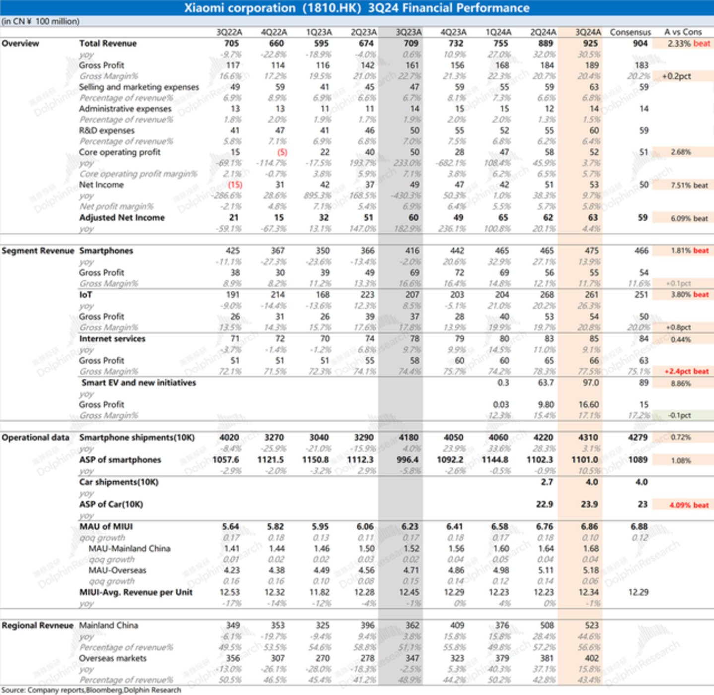 当前市场最关注的是公司汽车业务的进展情况。纯看汽车业务,小米公司2024年第三季度汽车业务实现营收97亿元,好于市场预期(89亿元)。