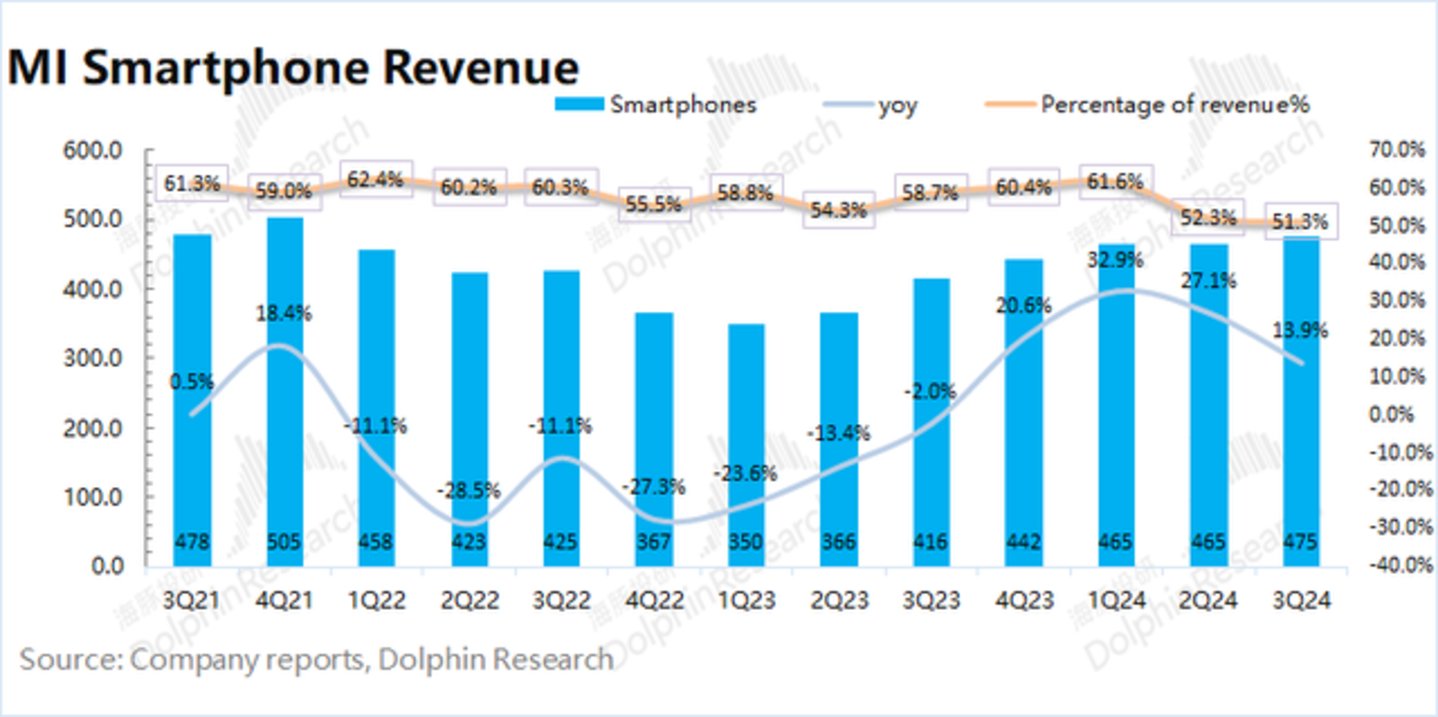 2024年第三季度小米智能手机业务实现营收475亿元,同比上升13.9%。公司本季度手机业务的增长主要得益于出货量和出货均价的同比回升。