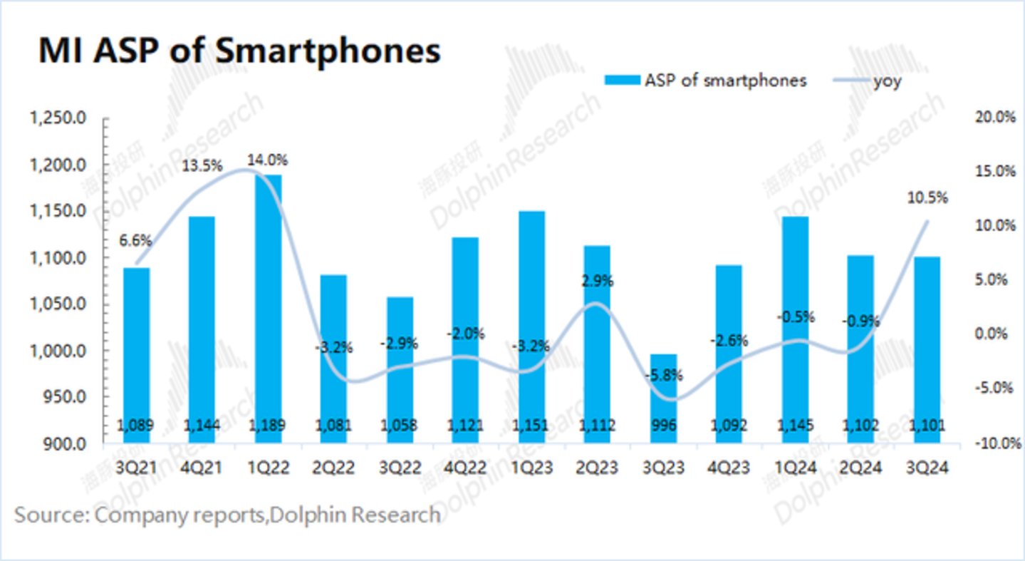 价:2024年第三季度小米智能手机出货均价1101元,同比增长10.5%。