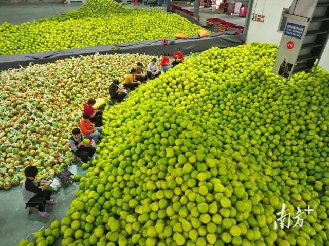 柚子分拣仓库内,工人正在打包柚子,准备发货。南方+记者 何森垚 摄