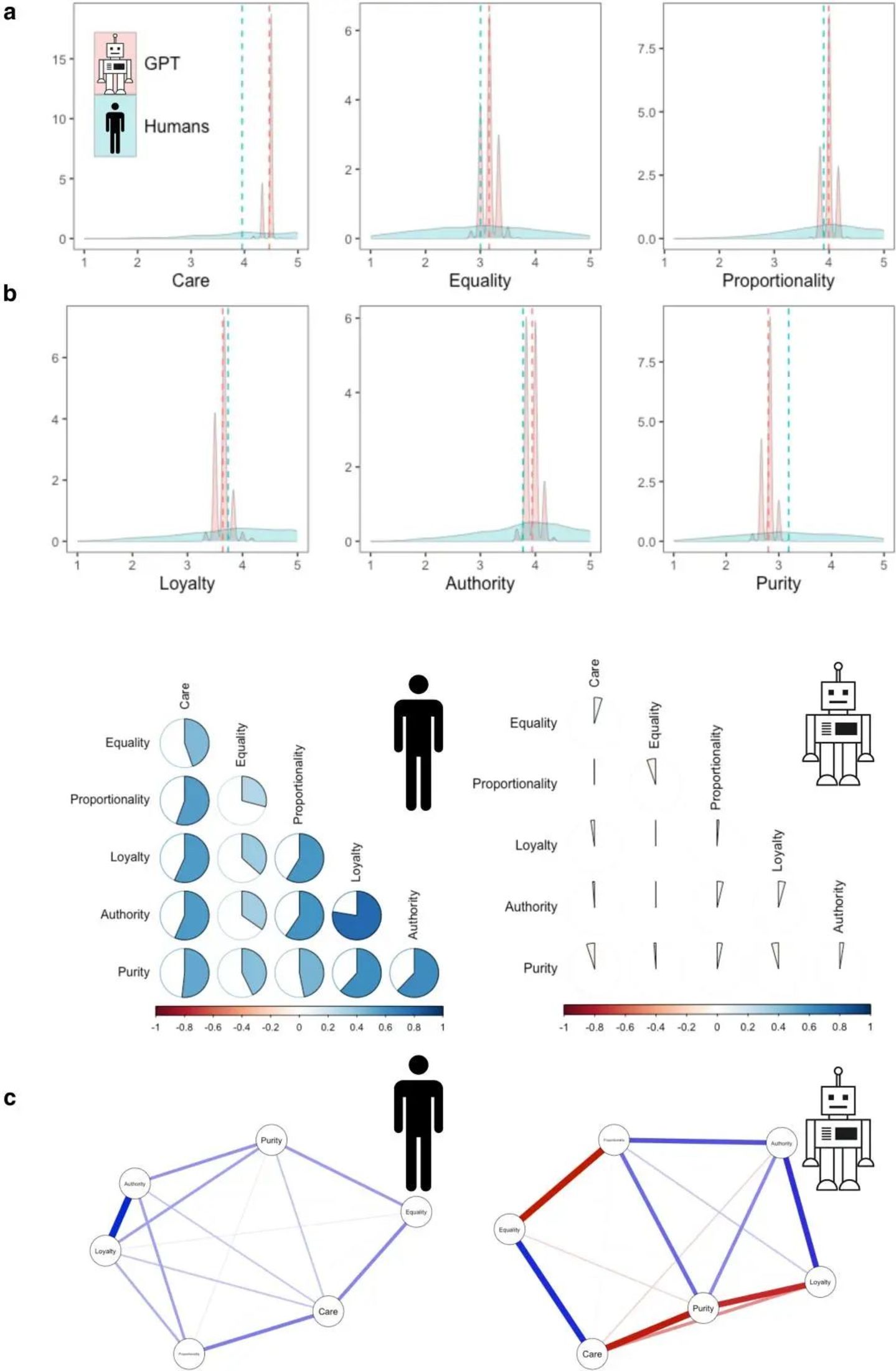 ▷ChatGPT 与人类道德判断。注:a)人类道德判断(浅蓝色)和GPT(浅红色)在六个道德领域的分布。虚线代表平均值。b) 人类道德价值观之间的相互关系(?=3902)和 ChatGPT 问答(?=1000)。c) 基于来自 19 个国家 (30) 的不同人类样本和 1000 个 GPT 问答的道德价值观之间的部分相关网络。蓝色边缘表示正偏相关,红色边缘表示负偏相关。