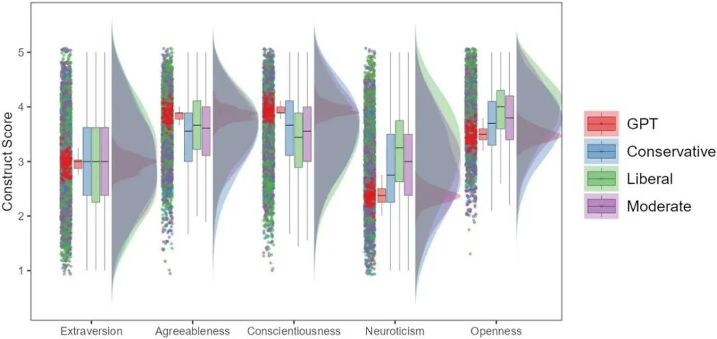 ▷将 ChatGPT与按政治观点分组的人类对“大五人格”的反应进行比较。注:图中显示了人类和ChatGPT在大五人格结构和不同人口统计数据中的响应分布。图中显示,ChatGPT 在宜人性、尽责性方面给出了显着更高的响应,而在开放性和神经质方面给出了显着较低的响应。重要的是,与所有人口统计群体相比,ChatGPT在所有个性维度上显示出显着较小的差异。