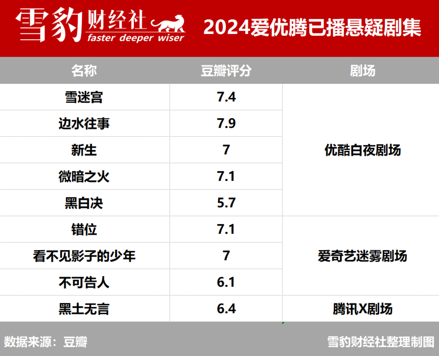 2024年,爱优腾在悬疑剧的争锋进入新的阶段。上半场,优酷白夜剧场积累了一些口碑和成绩。截至目前播出的剧集,优酷的《边水往事》和《雪迷宫》豆瓣评分排前两名,优酷的《微暗之火》与爱奇艺的《错位》并列第三。