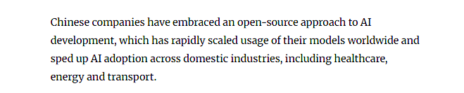区别于部分国家采取的相对封闭模式,中国选择了一条特色鲜明的开源发展路径。《南华早报》近日报道认为,通过开源策略,中国企业快速扩大了其模型在全球的覆盖范围,并有力推动了AI在医疗、能源、交通等国内各行业的落地应用。这一路径不仅降低了技术使用门槛,也有助于促进全球开发者生态的繁荣。