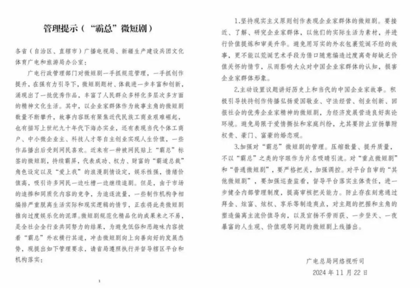 近日,广电总局发布霸总类微短剧管理提示,明确要求平台平台落实主体责任,不以霸总之类的字眼作为片名吸睛引流。同时,广电总局还提出了三个方面的要求:避免用写实的外衣包裹荒诞不经的故事,损害企业家群体形象;主动设置议题讲好中国企业家故事;加强对“霸总”微短剧的管理,压缩数量、提升质量。