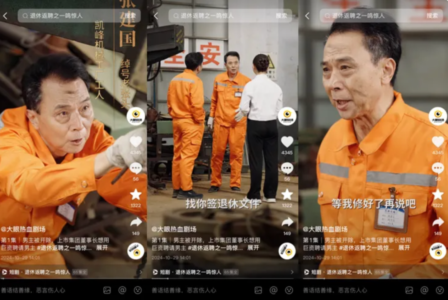 中老年短剧也绝不仅限于主流观众眼中“霸总爱上绝经的我”,观众对于亲情、家庭的情感需求,追求自我实现的精神需求,远非甜宠剧所能够满足和囊括。不久前,一部名为《退休返聘之一鸣惊人》的短剧连续两天登顶DataEye热力榜,在抖音、快手等平台均表现不俗。