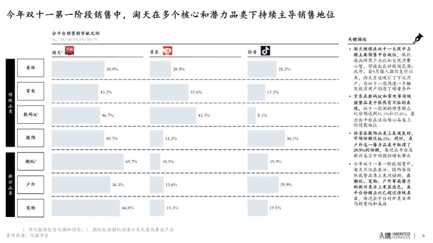 淘天的优势品类是服饰和美妆。据消费研究机构久谦中台发布的今年双11第一阶段销售数据显示,淘天在美妆和服饰类目占比分别达到50.9%和50.7%,维持其主导销售地位;在潮玩、宠物和户外等新兴品类中,淘天显示出更强的销售引领能力,市场占比高达69.7%、66.0%和56.5%,依然是新品类快速增长的主要孵化平台。