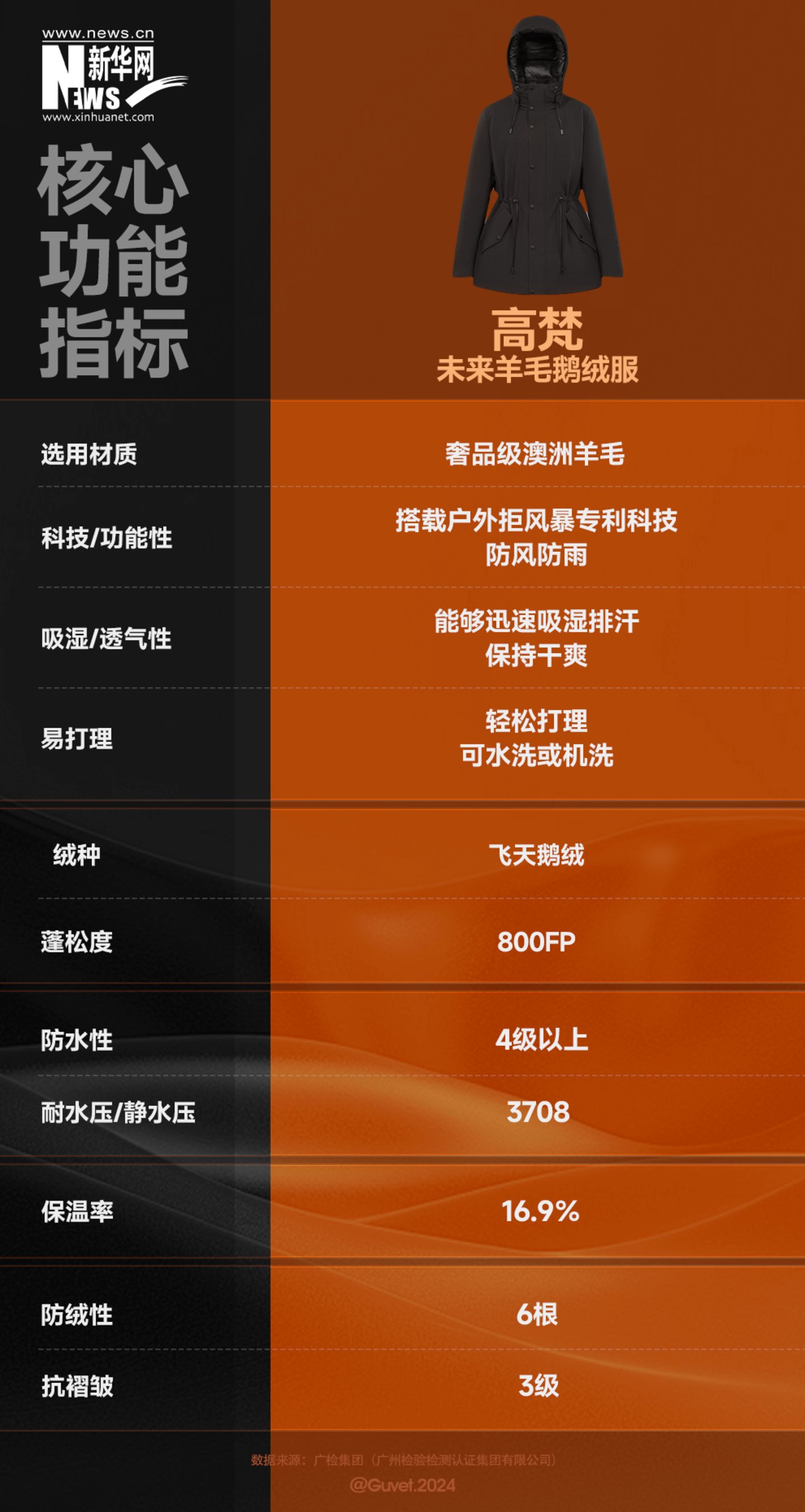 根据近期新华网报道,一项针对高梵鹅绒服检测报告显示,在羽绒服评价的六项关键指标上,高梵首创的未来羊毛鹅绒服已经全面超越了国际知名品牌某鹅。