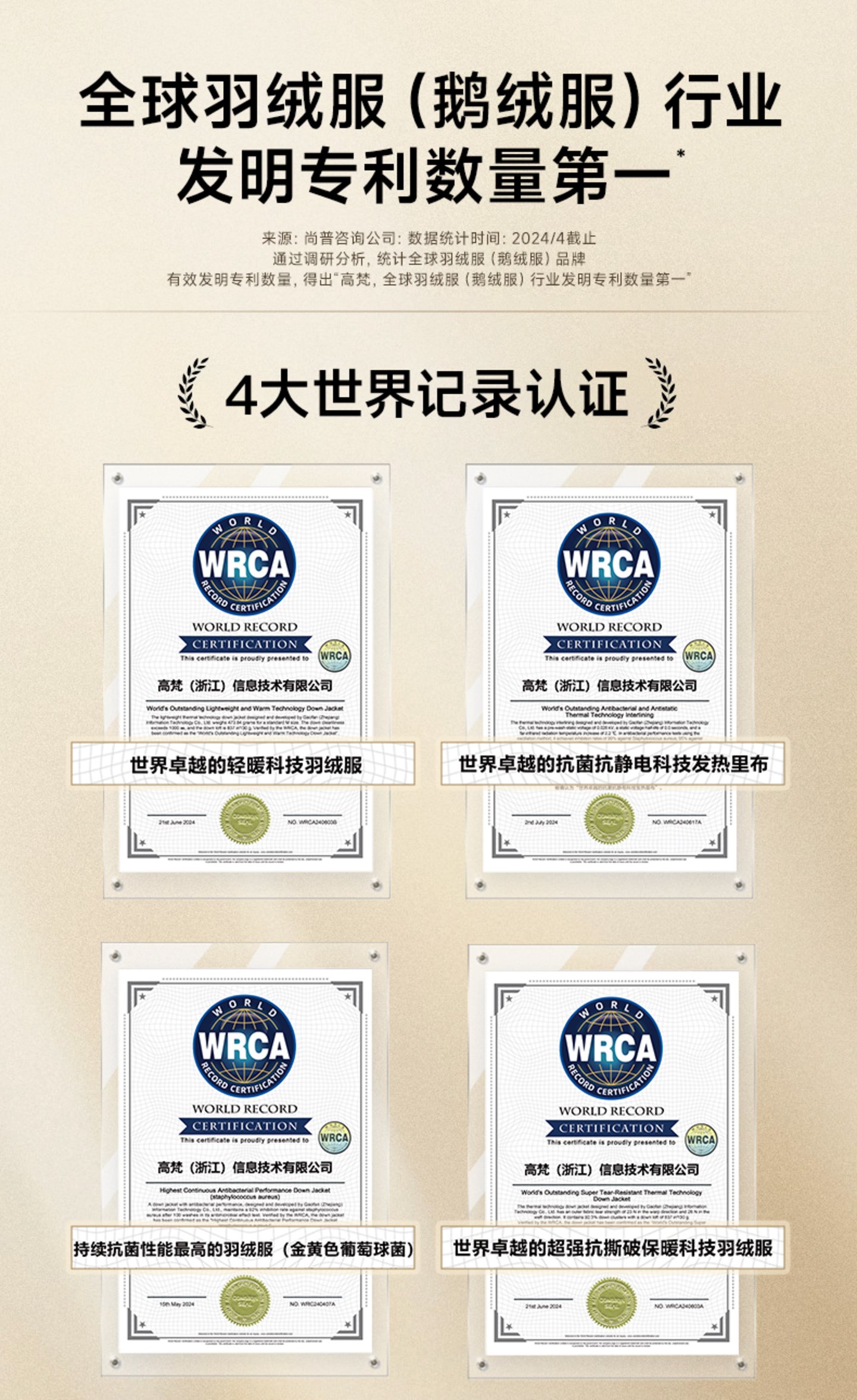 值得注意的是,高梵的这些突破,不仅仅停留在产品层面,更通过专利技术进一步打破了行业的“高端壁垒”。目前高梵已拥有161项发明专利,并获得全球纪录认证机构WRCA(世界纪录认证)关于最轻暖、最抗静电、最抗菌、最抗撕破的四项世界纪录认证。