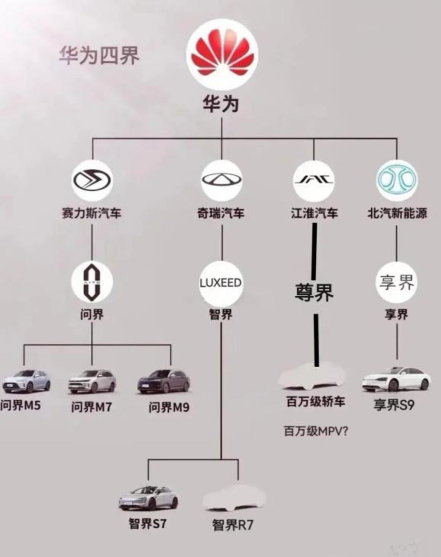 江淮+华为—尊界,定位百万级别行政豪车,对标宾利、劳斯莱斯、迈巴赫等;