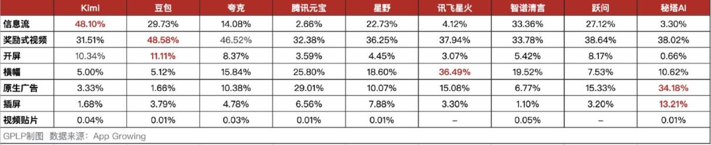 因为各家AI厂商在营销策略上都有想法,各家挖金用的“铲子”自然各式各样,一方面体现的是各家AI公司在广告形式上各有侧重。