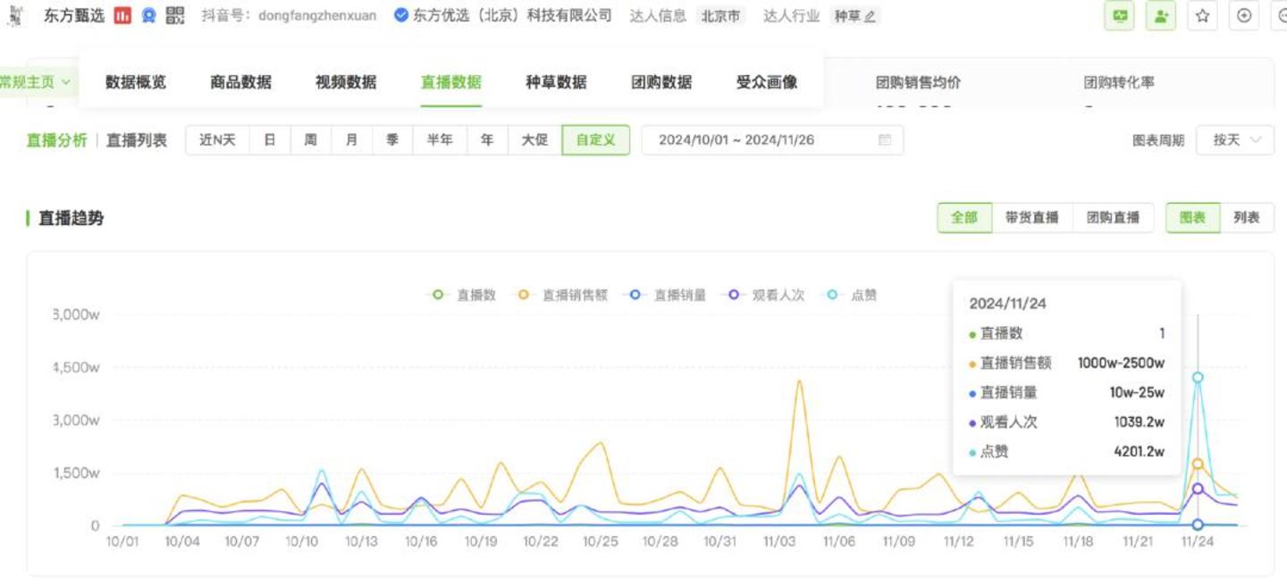 飞瓜数据显示,11月24日,孙东旭复播首日,直播间观看人次高达1039.2万,点赞数更是创近两个月新高,达到4201.2万。但直播销售额并没有大涨,GMV为1500多万元。成绩没有超越东方甄选11月4日的一场直播,该场直播销售额约4000万元左右。