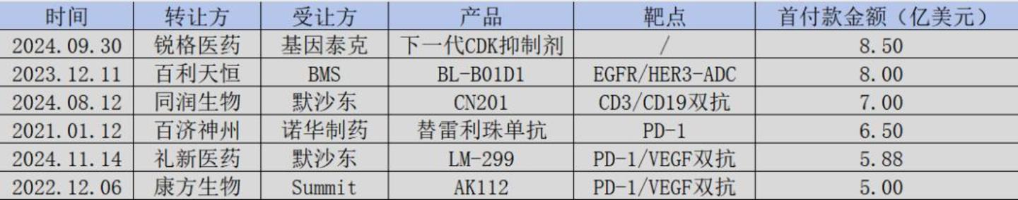 图:中国创新药BD首付款排名,来源:锦缎研究院