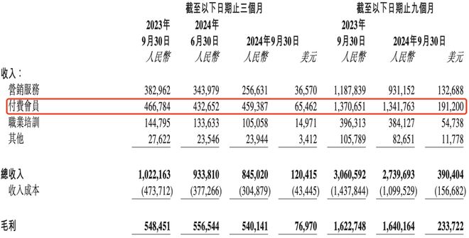 知乎2024年第三季度各项收入构成情况