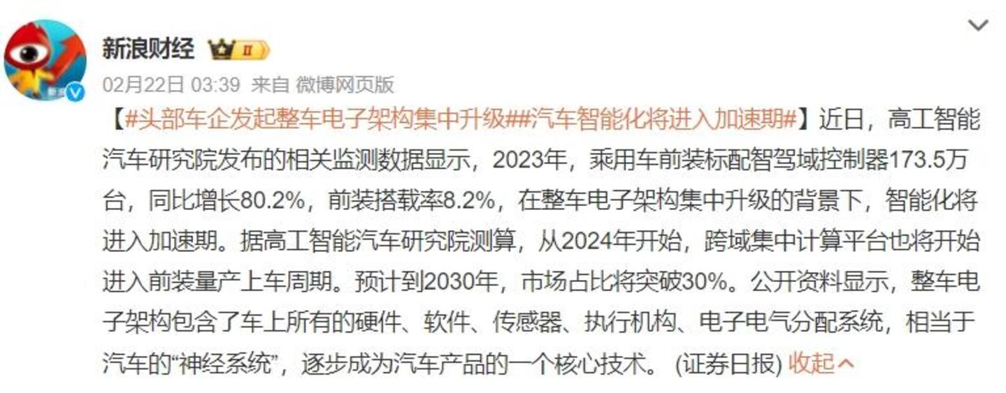 当前,整车电子电气架构已经进入了跨域融合时代。根据“高工智能汽车研究院”数据,2024年开始,跨域集中计算平台(舱驾一体、HPC+ZCU)将开始进入前装量产上车周期;预计到2030年,市场占比将突破30%。