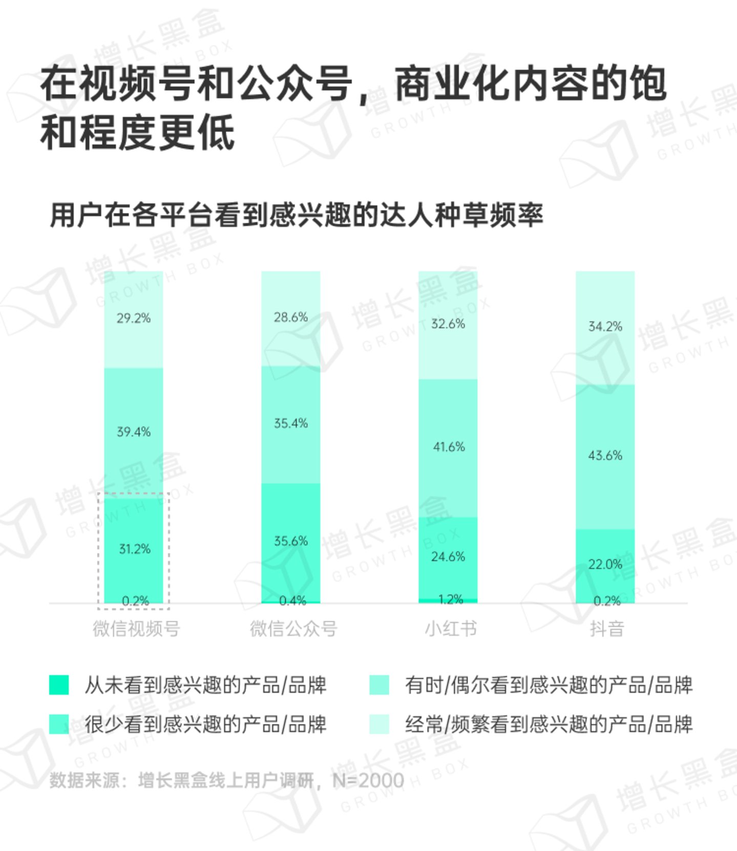 我们统计了用户在各平台看到感兴趣的达人种草频率,从内容供给来看,有31.4%的视频号用户和36.0%的公众号用户表示从未/很少看到感兴趣的产品或品牌,对比来看,这组数据显著高于抖音和小红书,用户需求并未被完全满足。