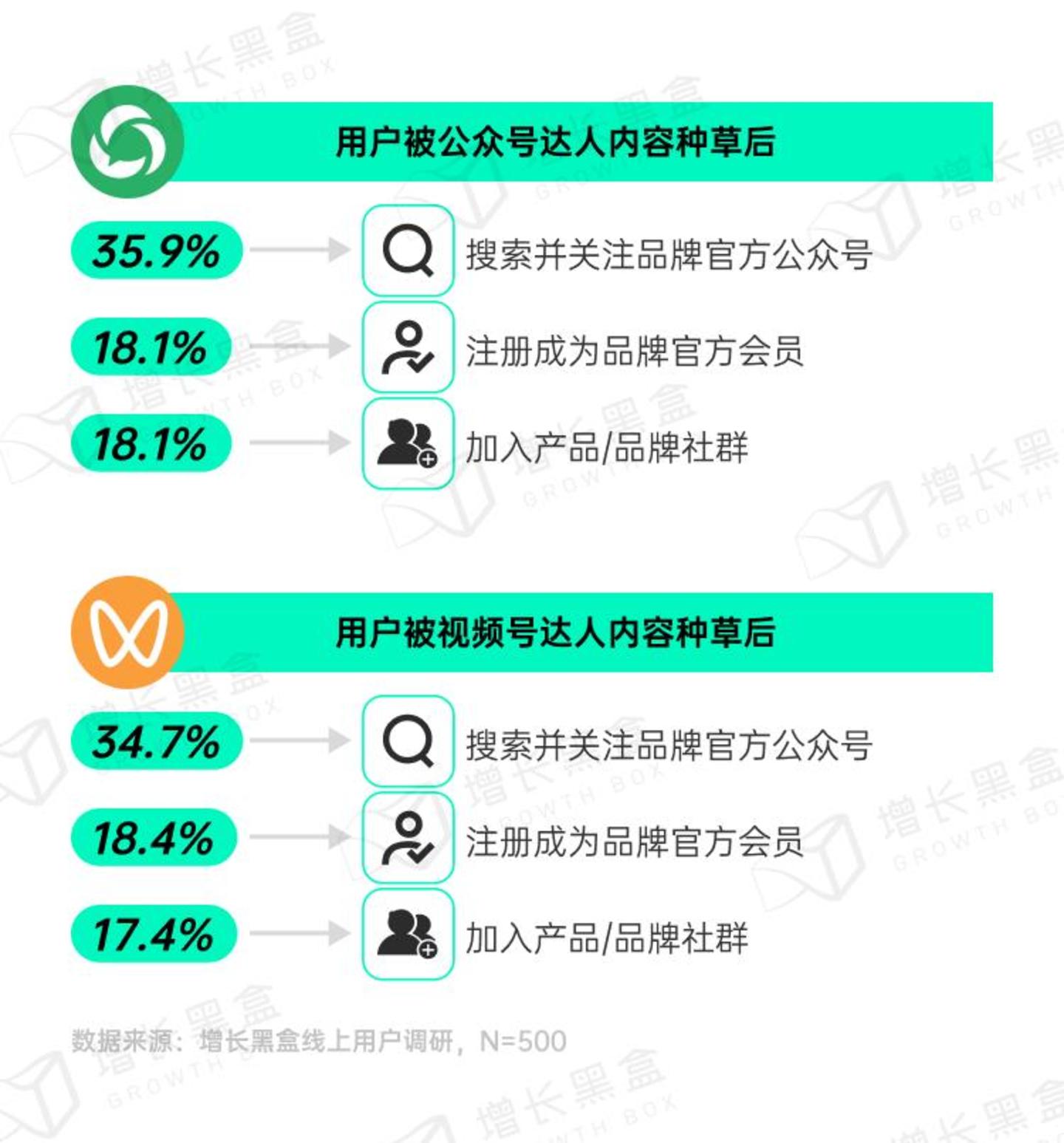 当然,公众号与视频号的差异在于:视频号的后续搜索行为占比更高,而公众号的后续分享、线上/线下购买、线下体验的占比更突出。
