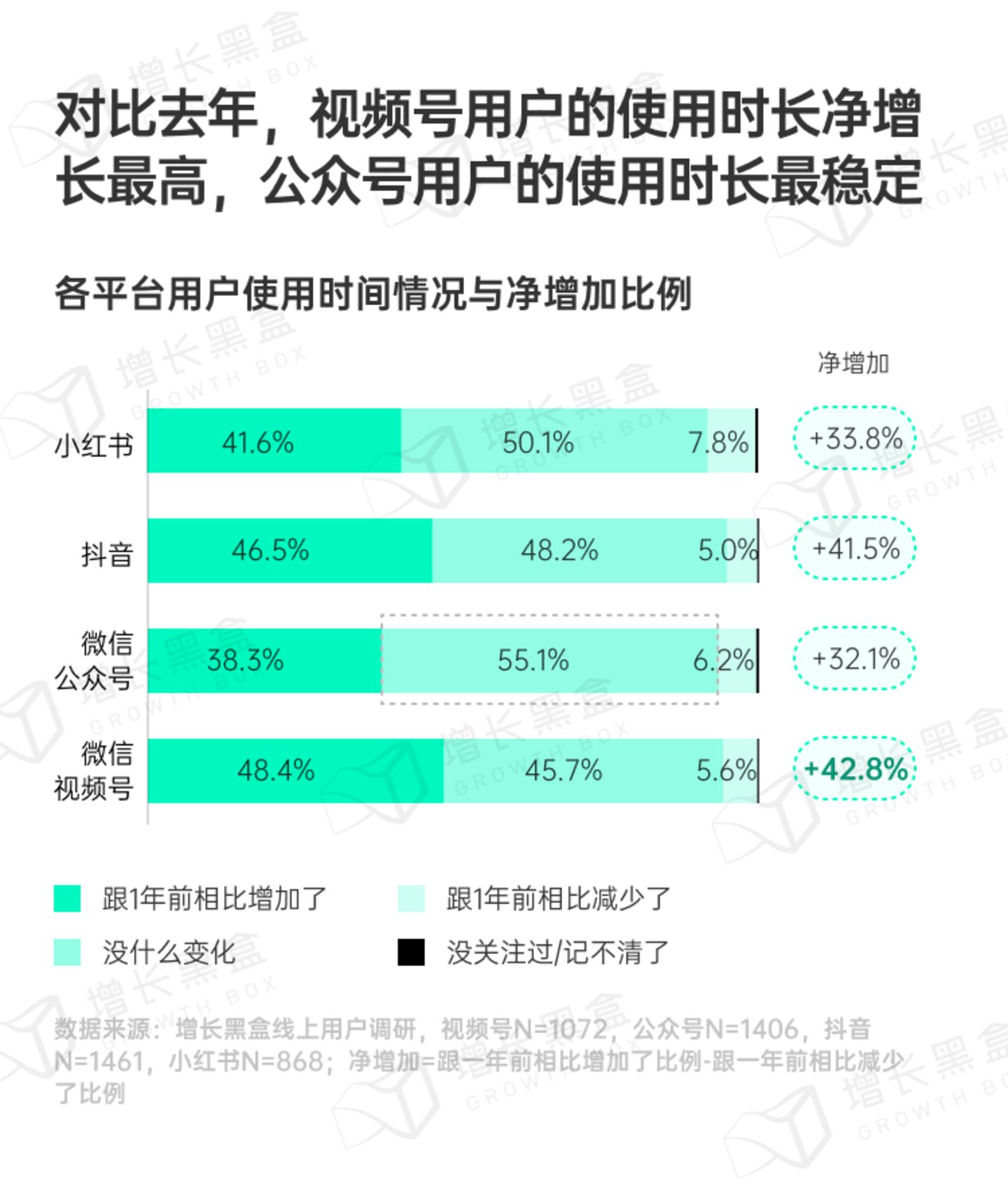 对比其它平台,视频号与公众号过去一年使用时间增加的老用户: