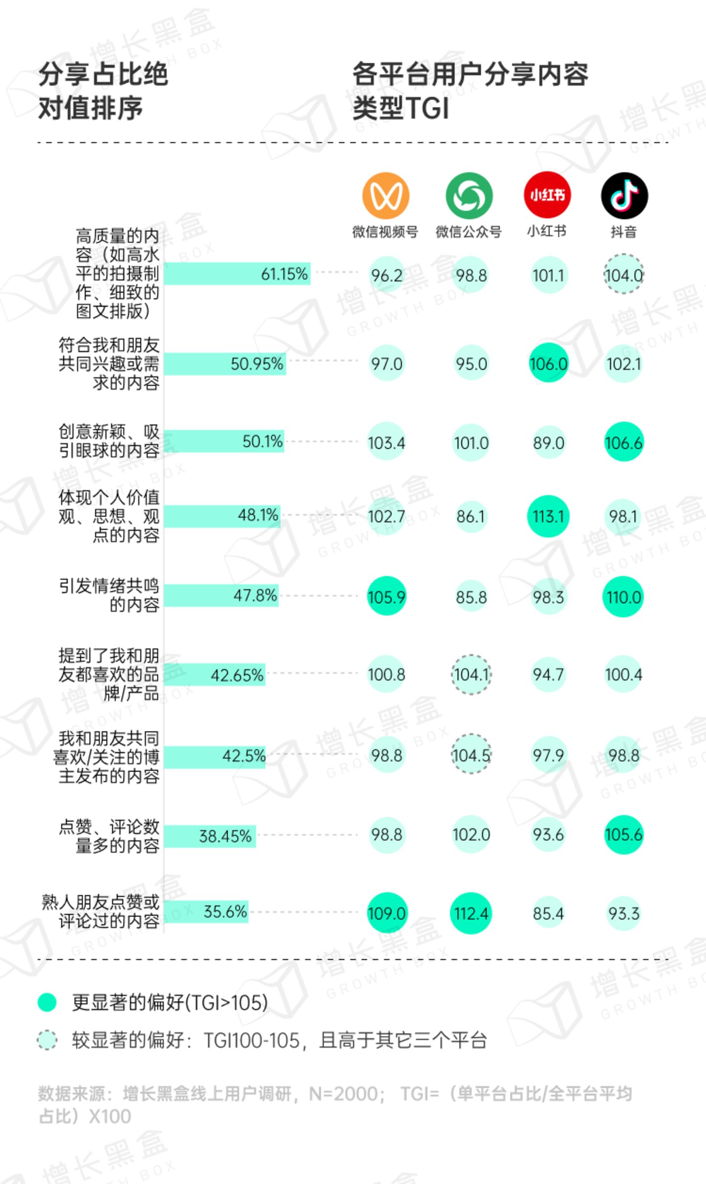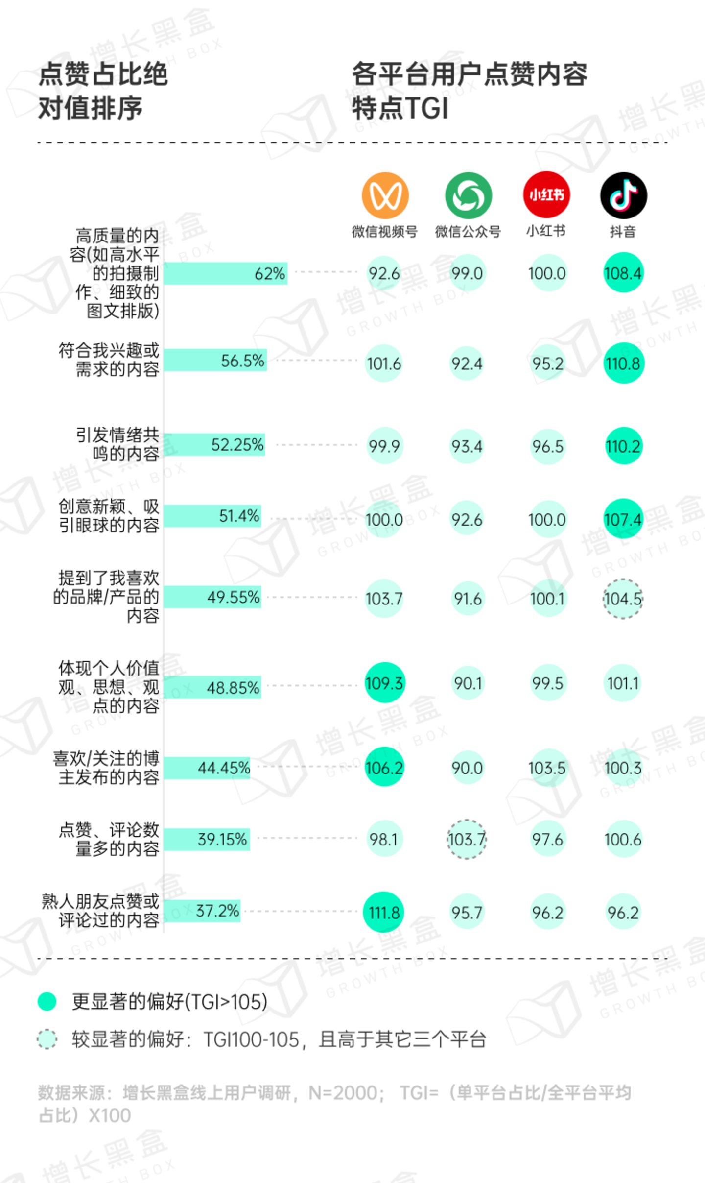 调研数据显示,用户在视频号上的转赞评偏好熟人点赞过的内容、喜爱博主生产的内容和体现个人观点的内容,在公众号上的转赞评偏好熟人点赞或评论过的内容 - 这进一步体现了微信生态社交推荐的价值。