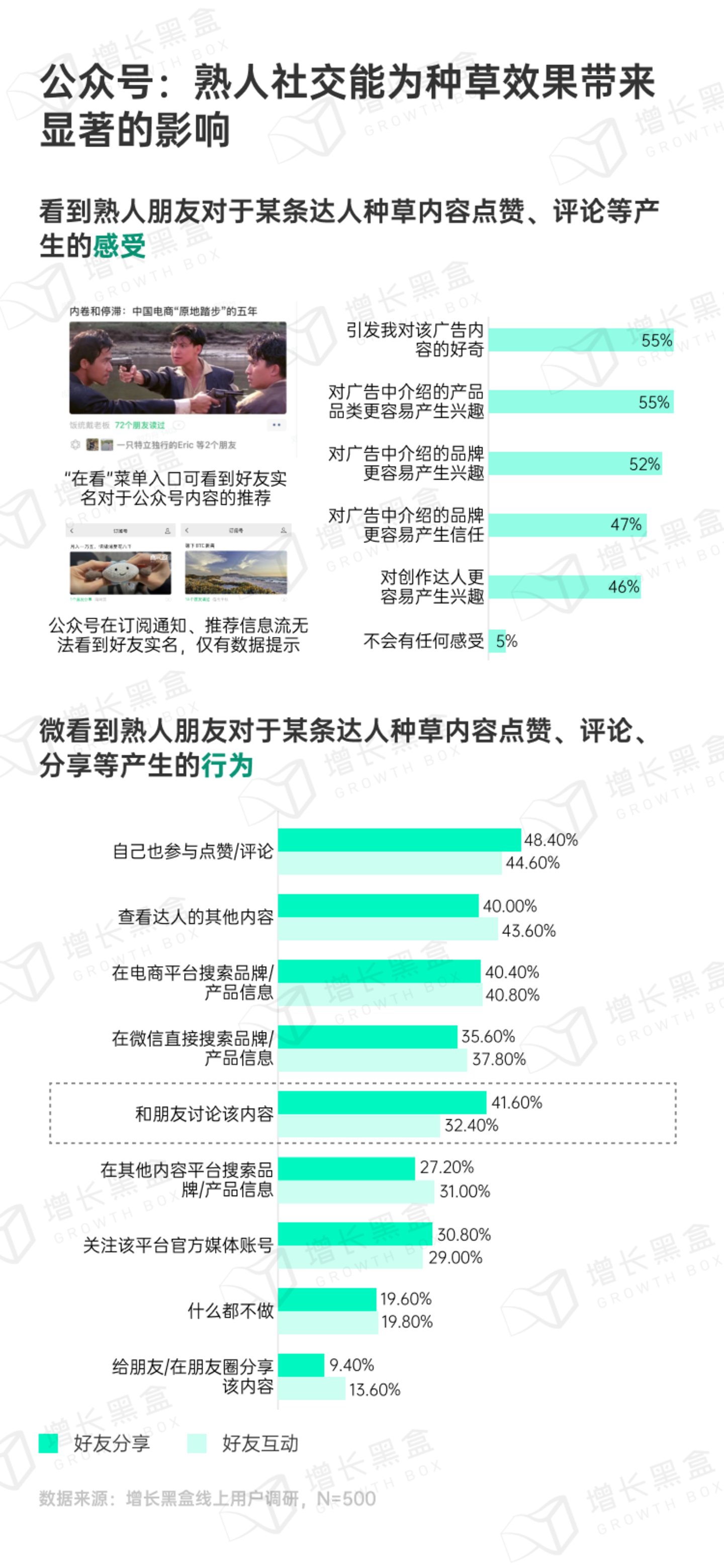 在看到熟人对种草内容的互动后,视频号和公众号均有超过80%的用户会采取后续的行为。超过60%的用户表示至少会采取一项相关的搜索行为。